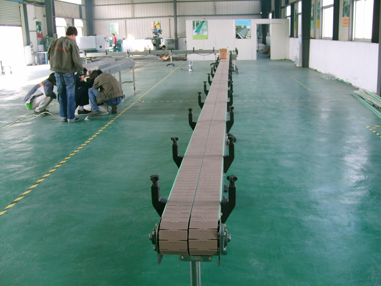 鏈板輸送機在進行安裝時也需要注意以下相關事項,由于鏈板輸送機的制動裝置反應靈敏可靠,其限位夾緊裝置也應該能夠獨立受工作狀態下最大風力而不致被風吹動。鏈板輸送機的機架安裝首先是從頭架開始的、然后順次安裝各節中間架,最后裝設尾架。根據相關的規定和原則,我們的生產的鏈板生產線都是采用標準頂板鏈為承載面,由電機減速機為動力傳動,支承在專用導軌當中。頂板鏈也可以進行選碳鋼、不銹鋼或是熱塑鋼鏈,選用不同形狀的平板形式,以完成平面輸送,平面轉彎、提升下降等各種功能。