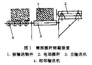 ①側(cè)面推桿轉(zhuǎn)載裝置如圖1所示,它主要是通過操縱往復(fù)式電動推桿2(或氣缸、液壓缸)推動被輸送物件1,使之離開主線輸送機(jī)3進(jìn)入相鄰分支輸送機(jī)4。該推桿轉(zhuǎn)載裝置結(jié)構(gòu)簡單,安裝方便。由于其工作方式是從物件側(cè)面推移,它的安裝方位隨相鄰輸送機(jī)的運(yùn)行方向而定,且通常是安裝于主輸送機(jī)的側(cè)面,只需較小的地面空間。其缺點(diǎn)是因?yàn)樗苯訉⑽锛膫?cè)面推入與主線輸送機(jī)呈90轉(zhuǎn)角的鄰近輸送機(jī)上.只適于物件作直角轉(zhuǎn)向,且不適于易碎、怕擠壓的物件。這種轉(zhuǎn)載裝置適用于輸送多種外形尺寸或重量范圍變化較大的物件。