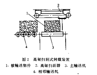 ②高架掃刮式轉(zhuǎn)載裝置其配置形式如圖2所示,工作方式類似于推桿轉(zhuǎn)載裝置,只是這種轉(zhuǎn)載裝置是安裝在滾筒輸送機(jī)的上方,通稱為高架掃刮器,利用氣缸或液壓缸在主輸送機(jī)3上方橫向往復(fù)運(yùn)動,帶動刮板將物件1從主線輸送機(jī)側(cè)向移開。它能把被輸送的物件從任意側(cè)轉(zhuǎn)移到鄰近的輸送機(jī)4上。這種轉(zhuǎn)載裝置的安裝僅占用主輸送機(jī)上方的一個較小空間,而不占用地面位置。其輸送物件范圍與前述推桿式轉(zhuǎn)載裝置相同。